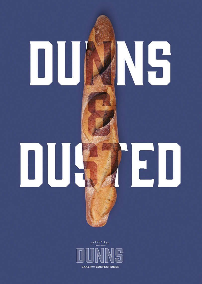 A rebrand for Dunns, a baker and confectioner in Crouch End that has been trading since 1820. The brief was to modernise a heritage brand without sanitising the character that 200 years builds. The identity uses a strong custom-influenced condensed typeface, a navy and kraft palette, and a wheat motif detail that nods to craft and provenance without sliding into cliche. The packaging system runs across carrier bags, kraft bread bags, and tissue-lined paper bags. The standout piece is the campaign poster: 'DUNNS DUSTED', with a baguette bisecting the oversized type, flour-dusted and done in one image. That combination of craft pride and wit is the whole brand in a single frame.