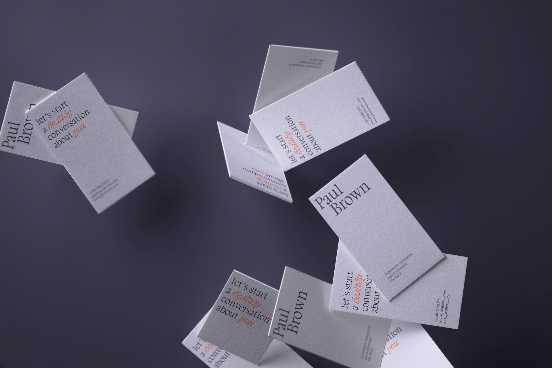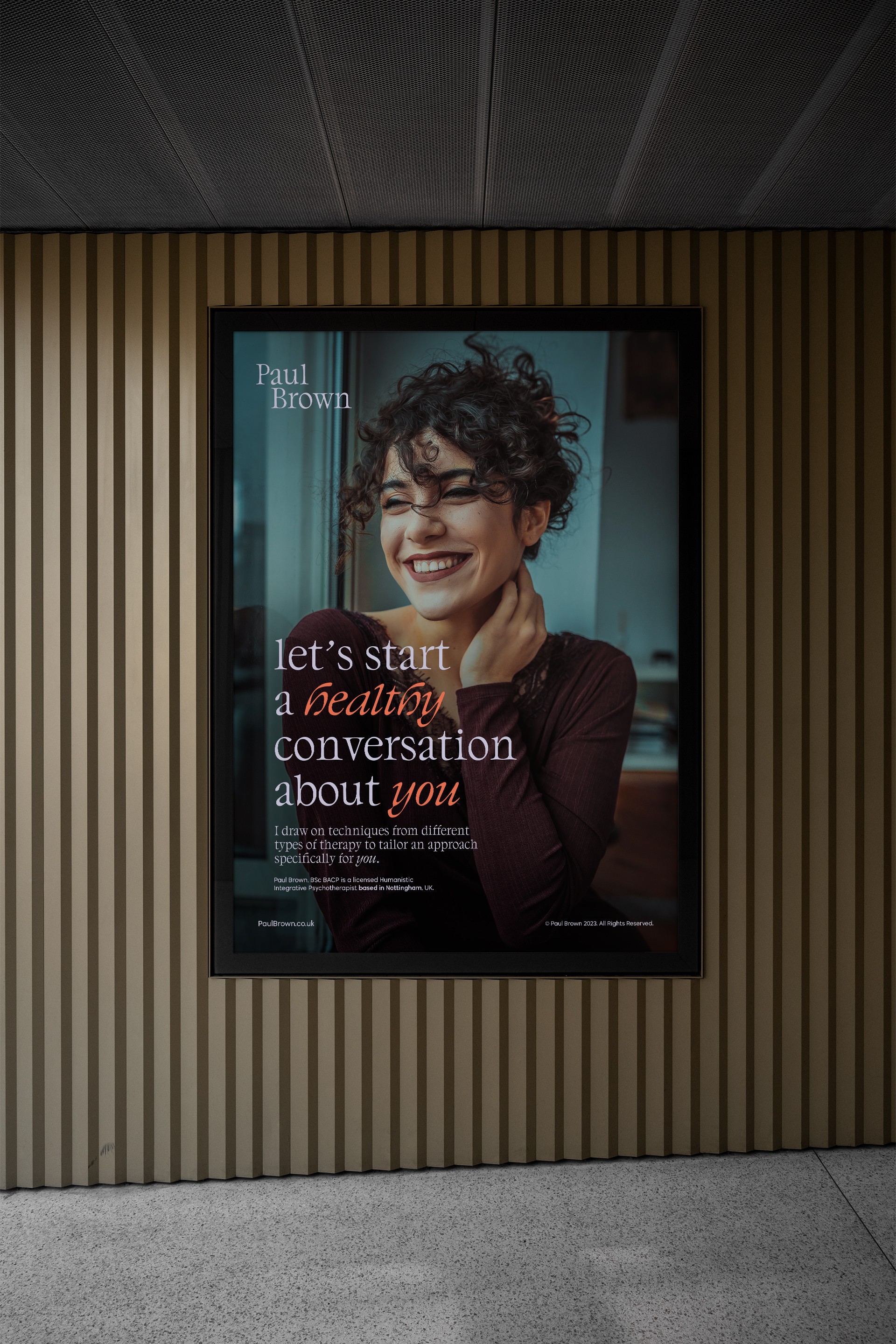A brand identity for Paul Brown, a humanistic integrative psychotherapist based in Nottingham. The challenge in healthcare branding is to feel warm and approachable without drifting into soft-focus stock photography territory. The solution is typographic: the tagline 'let's start a healthy conversation about you' uses a mixed weight system where 'healthy' and 'you' are set in a flowing italic script in a warm terracotta, while the surrounding text is clean and minimal. The combination feels genuinely personal rather than clinical. The identity rolls out across business cards, a print-ready poster, and a dark, refined website that leads with the words rather than the credentials.