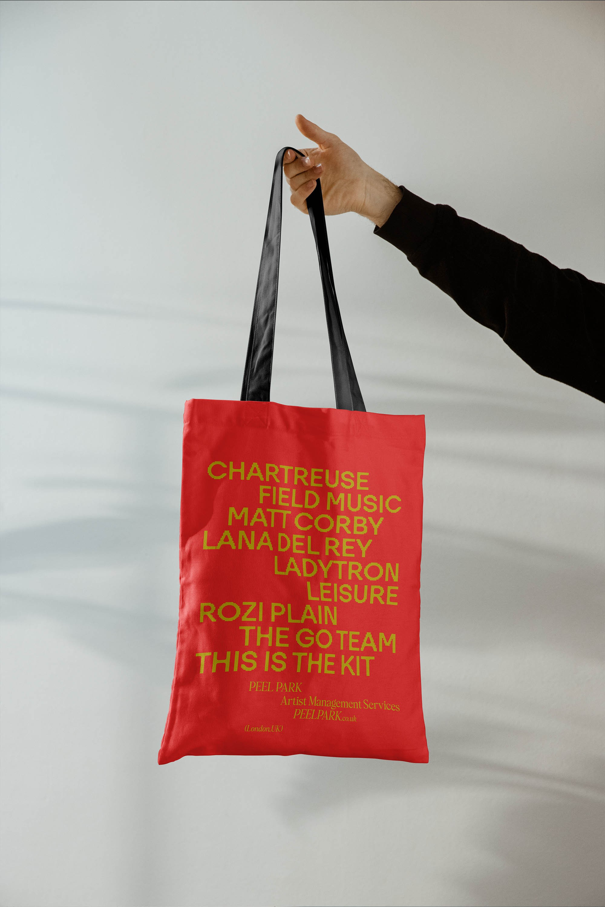 Peel Park launched with a visual identity that immediately reads as serious and independent in equal measure. The logo became the strongest single mark I have designed, and the full roster tote bag became a talking point in its own right. The brand now appears across London in a context (Underground advertising) that few independent music companies reach.