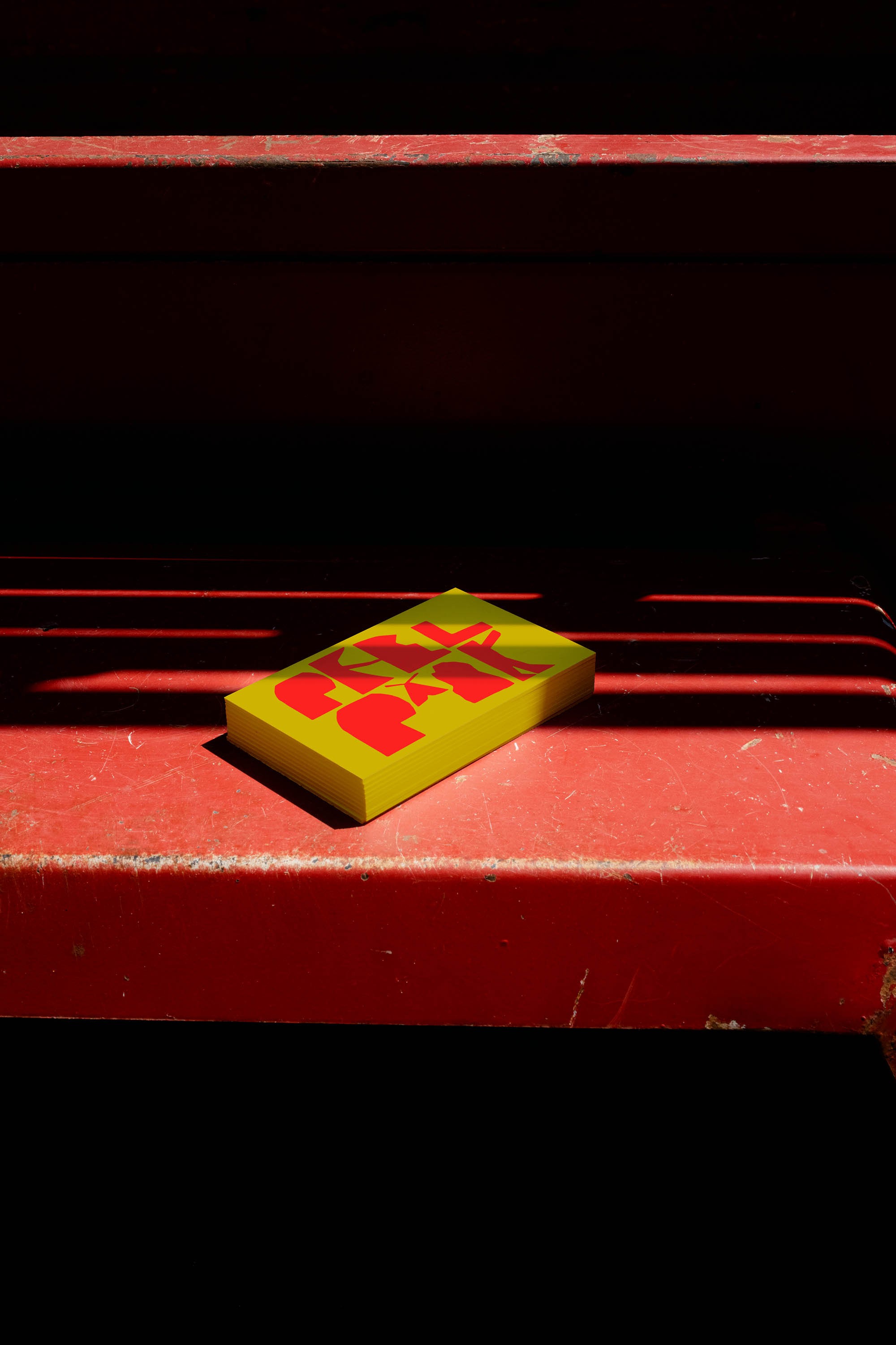 The centrepiece of the brand is a custom logotype where the fragmented, oversized letterforms of PEEL PARK are cut apart to reveal human silhouettes in the negative space. Artist figures are embedded directly into the wordmark. It is a logo that rewards a second look, but reads instantly at scale. The colour palette is deliberately confrontational: an electric tomato red paired with a chartreuse acid yellow, with black and white as clean alternates. The combination sits somewhere between a vintage gig poster and a contemporary art print.