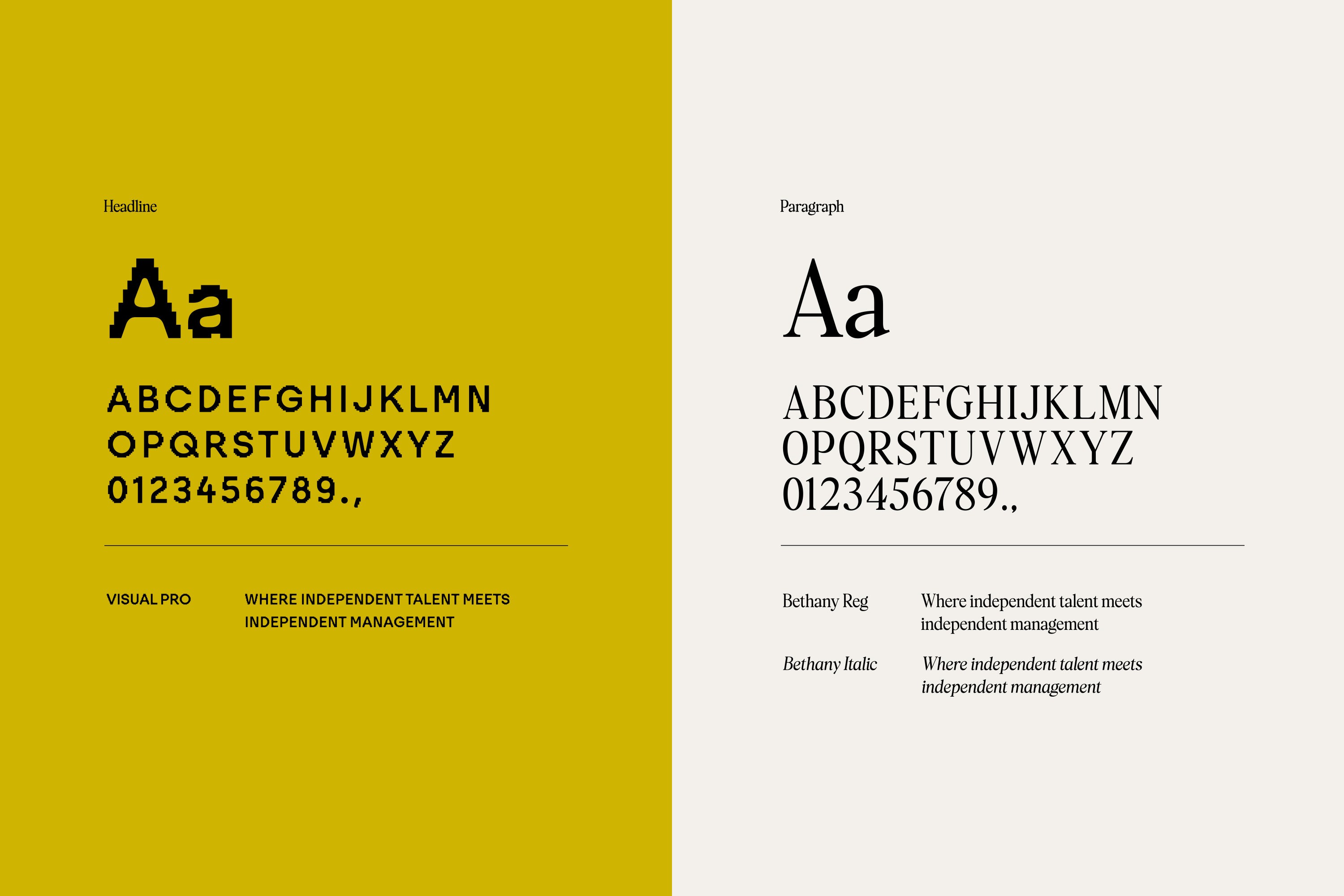 The supporting type system pairs a geometric sans (Visual Pro) for display and headings with Bethany, an elegant serif, for body copy. The tension between the two reflects the same duality in the brand itself: independent and energetic on the surface, professional and considered underneath.