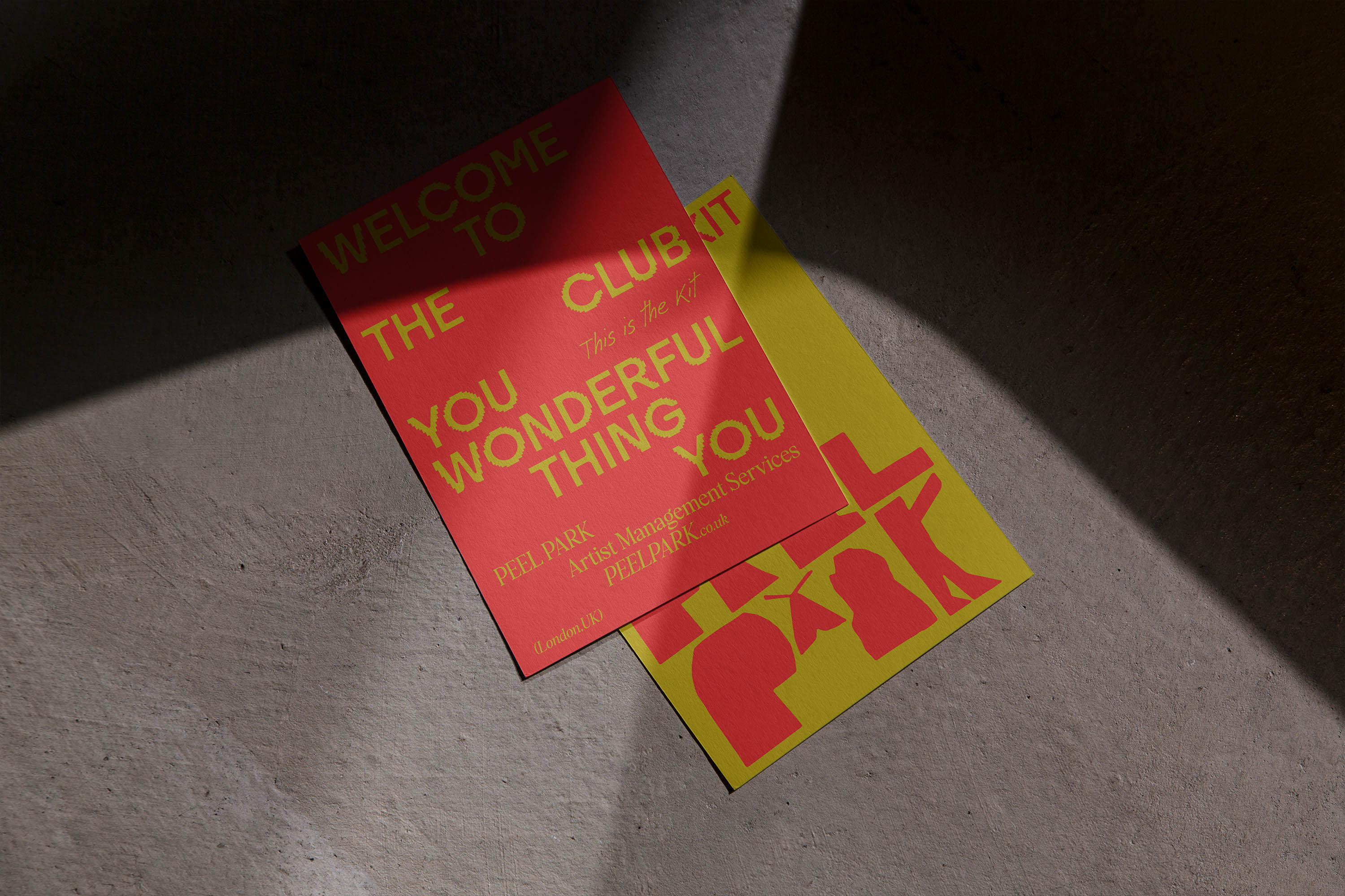 Peel Park is an independent London artist management company whose roster punches well above its size, with names including Lana Del Rey, Field Music, Ladytron, Rozi Plain, The Go Team, This Is The Kit, and Matt Corby. The brief was to build a brand that matched that ambition: something that could hold its own across everything from a business card to a London Underground advertising panel, and felt genuinely distinctive in an industry full of safe, forgettable identities.