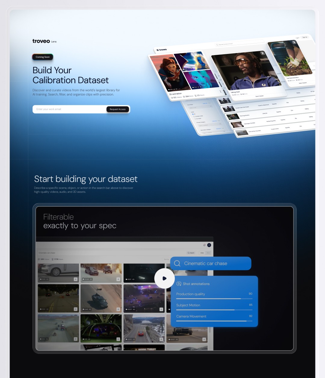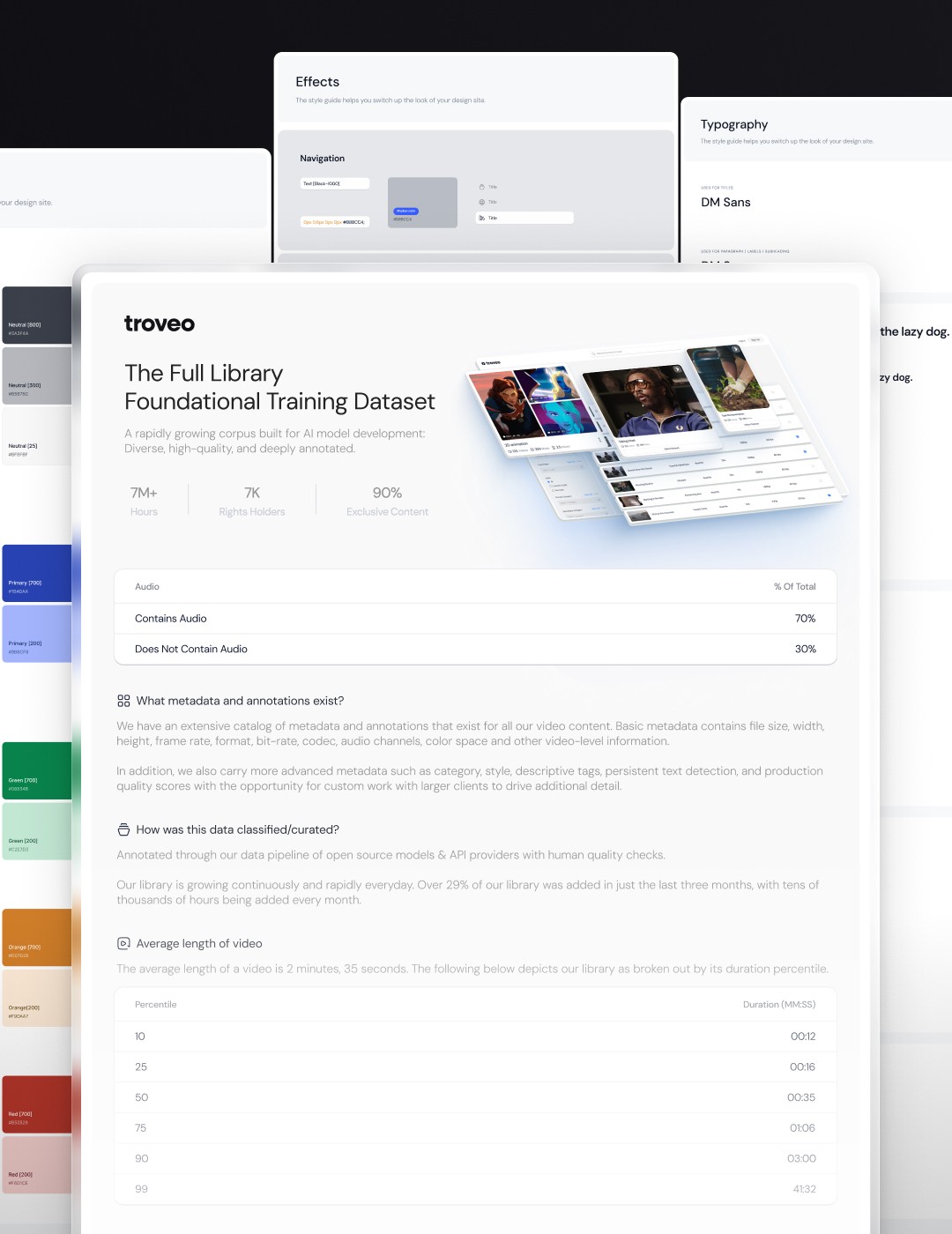 The design system I built was then adopted and extended by the engineering and product teams to ship Troveo Lens, the user-facing data marketplace. Alongside this, I produced pitch decks, brand films, social assets, and event collateral. AI tools were embedded throughout my workflow, expanding output so that one designer could cover the creative needs of an entire company during its fastest growth phase.